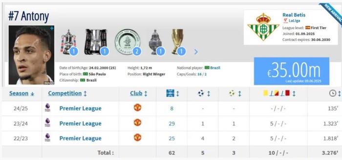 德转数据显示,贝蒂斯前锋安东尼此前的曼联生涯,在英超得到的黄牌数量为10张,而他的进球+助攻总共才8个。(5进球+3助攻)