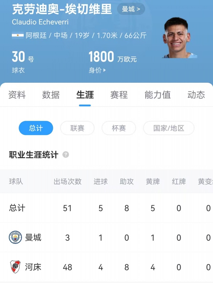 19岁的埃切维里冬窗正式加入曼城阵容,目前仅为曼城出场过3次,贡献1粒进球,现身价1800万欧。