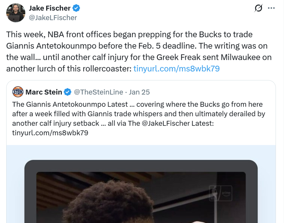 由于字母哥是现役稳定的前三超巨,美联社知名记者Tim Reynolds也曝出如果他一旦正式被摆上货架,联盟其余29支球队均对其有意。